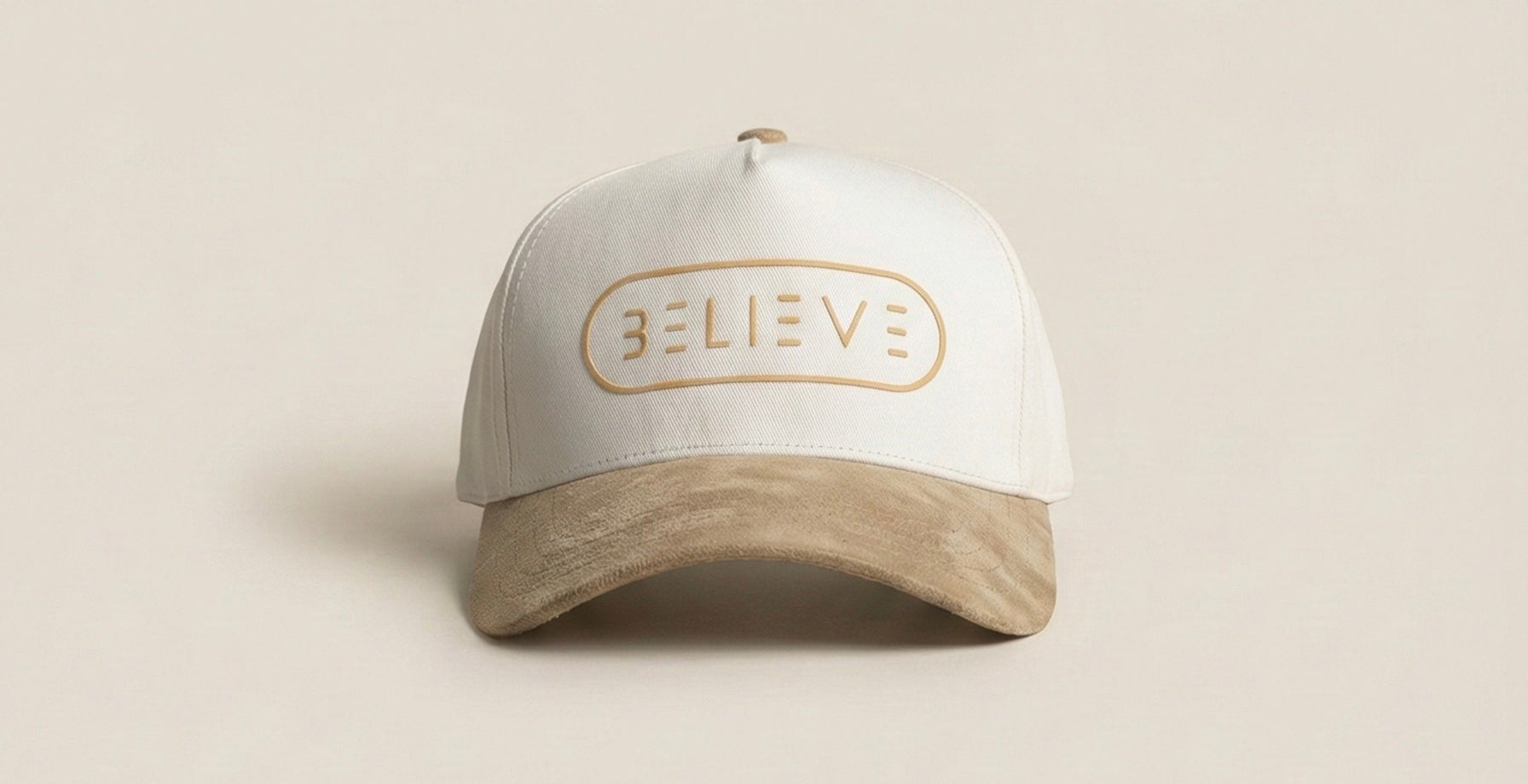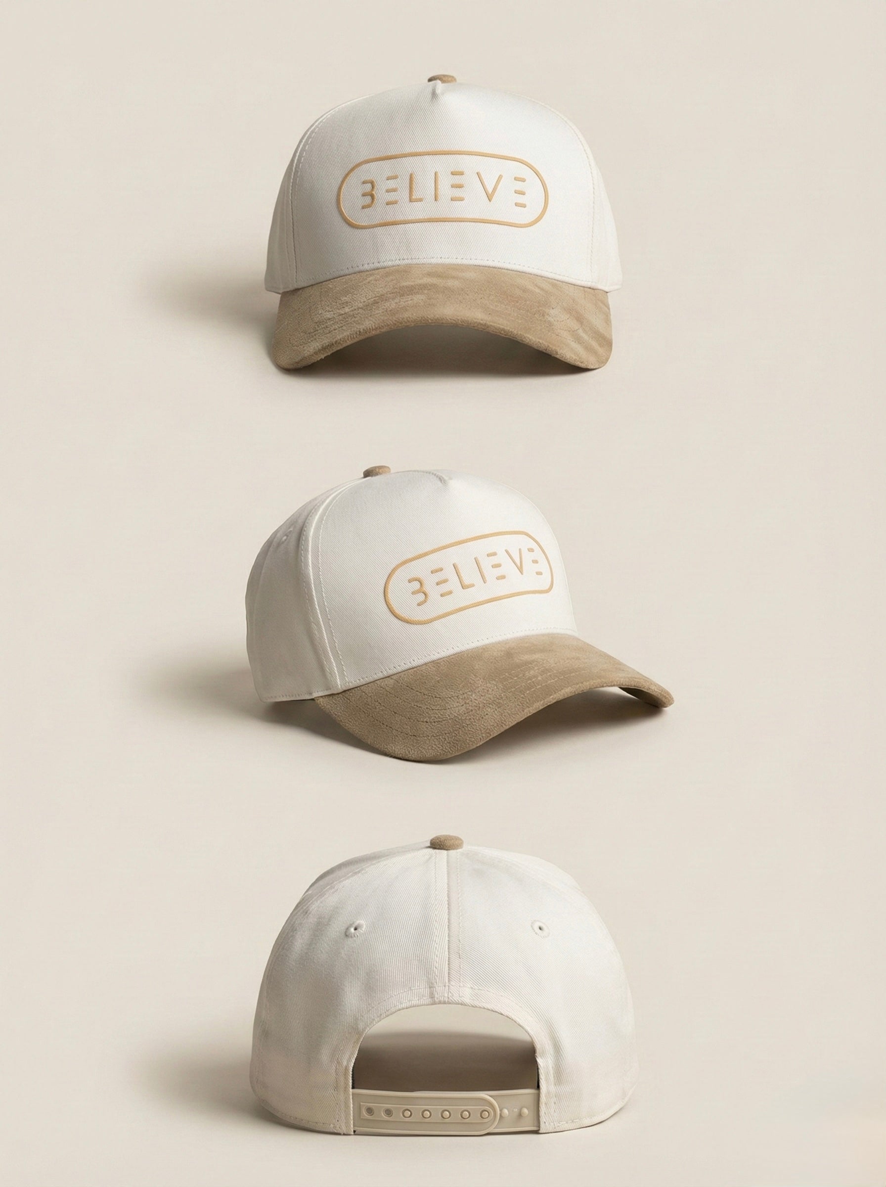 This hat features a crisp white crown paired with a soft tan suede-style brim, finished with our signature BELIEVE logo in a subtle tonal outline. It’s the perfect balance of simplicity and statement, making it easy to style with anything from casual fits to elevated streetwear.
