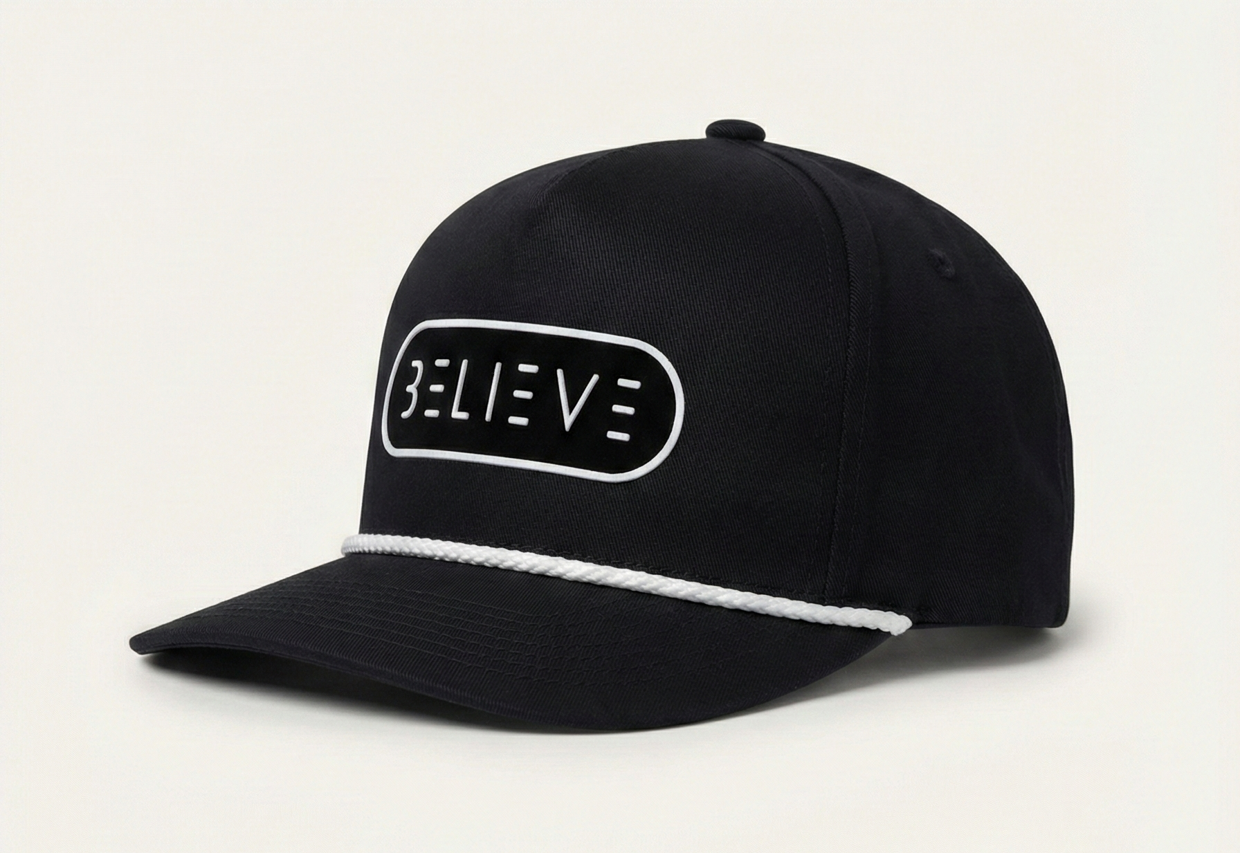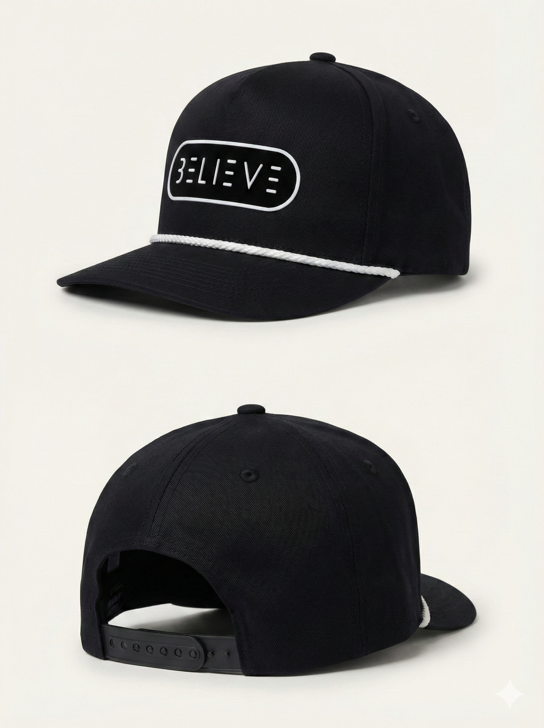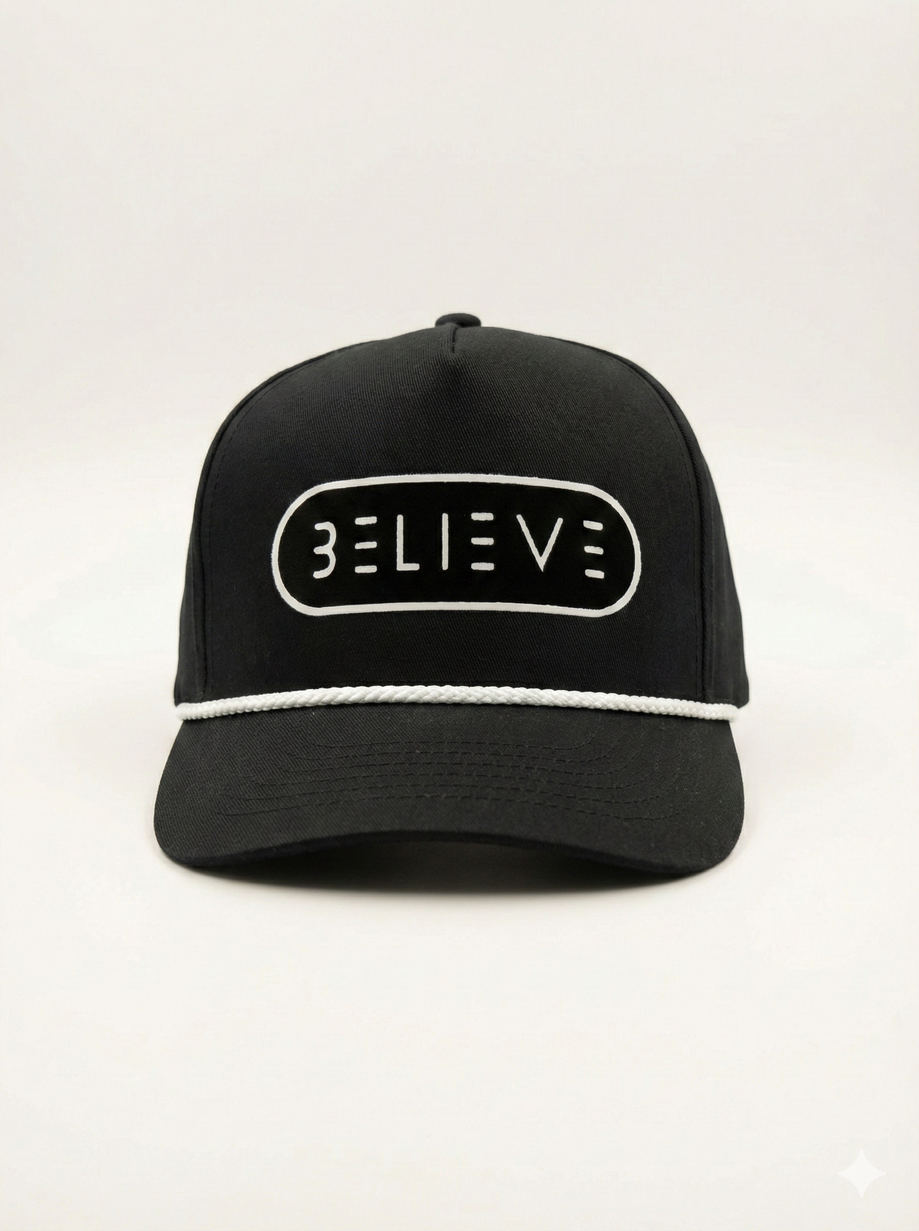 Classic, bold, and unmistakably Believe. The Believe Rope Snapback Hat features a sleek black crown with crisp white detailing for a timeless, elevated look. The front showcases the signature BELIEVE logo outlined in white, creating strong contrast and instant recognition.