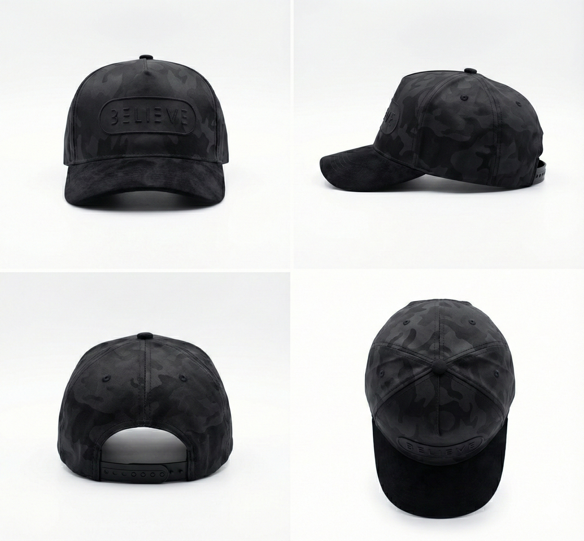 - Black satin-style crown with tonal camo texture