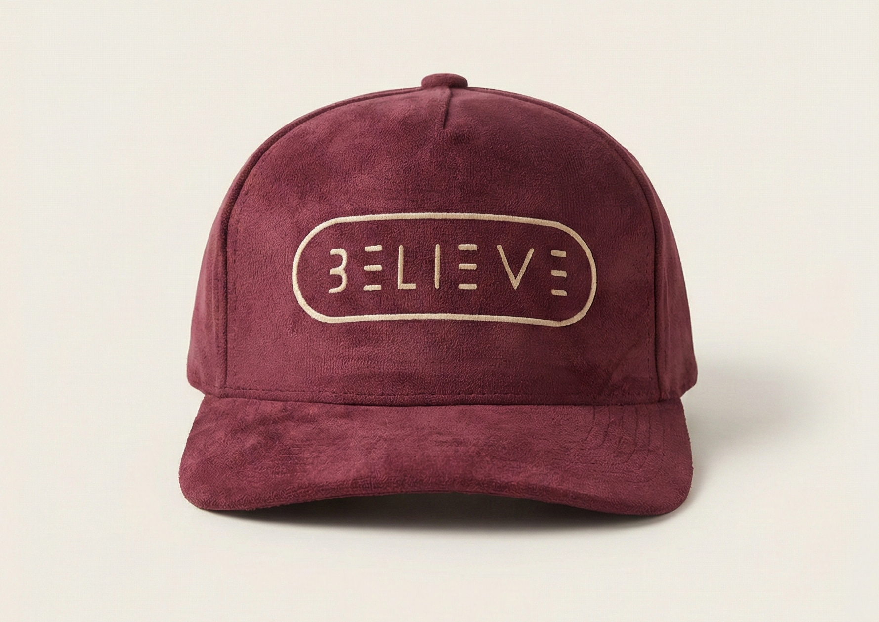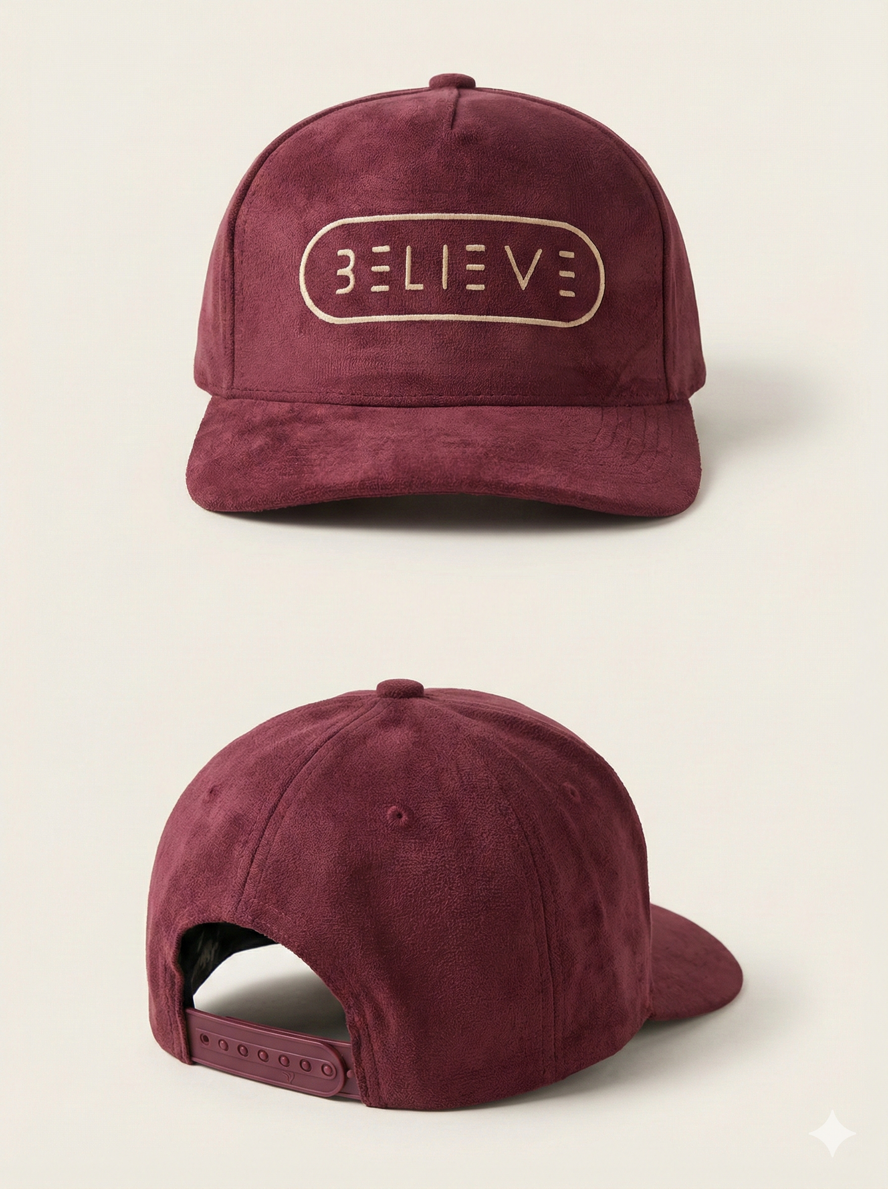 Make a statement without saying too much. The Believe Suede Snapback features a rich cranberry suede finish paired with clean tan BELIEVE , delivering a timeless look with a powerful message.