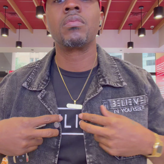 Crafted from durable, soft-washed denim, this jacket features a relaxed short-sleeve silhouette with a button-down front and chest pocket for a timeless look. The front is finished with a subtle “Believe In Yourself” print, while the back showcases bold varsity-style lettering paired with the inspiring script “Follow Your Path.” Every detail is intentional—built to remind you (and everyone who sees it) to stay true to yourself.
